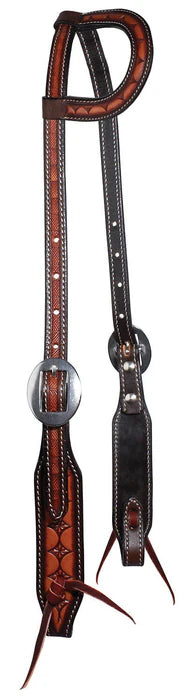 Shaped-ear headstall with stand-out diamond tooling set against a backdrop of honey with a deep chocolate border. Stainless steel hardware.