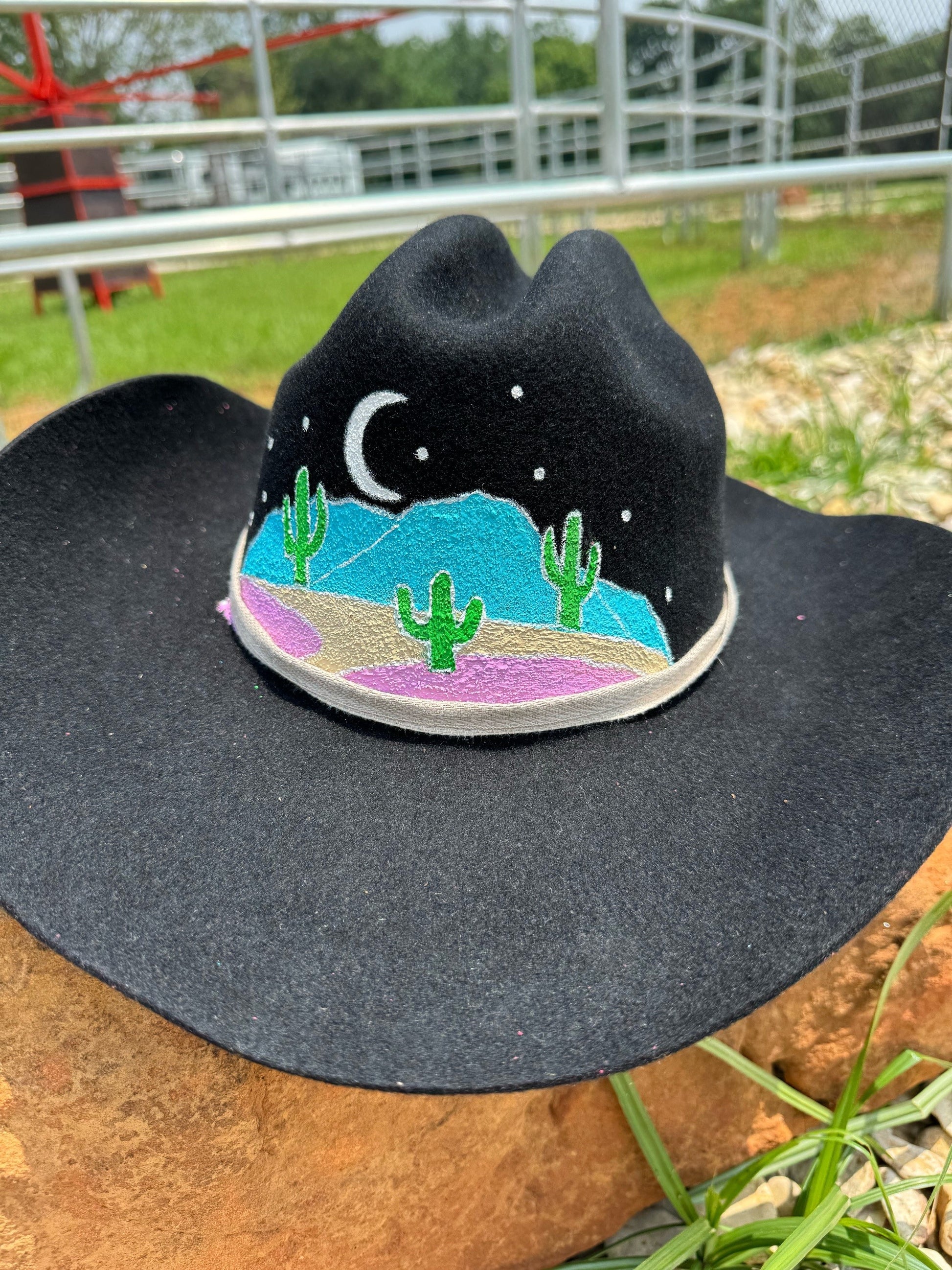 Black Hand Painted Desert Cactus Nights Cowboy Hat