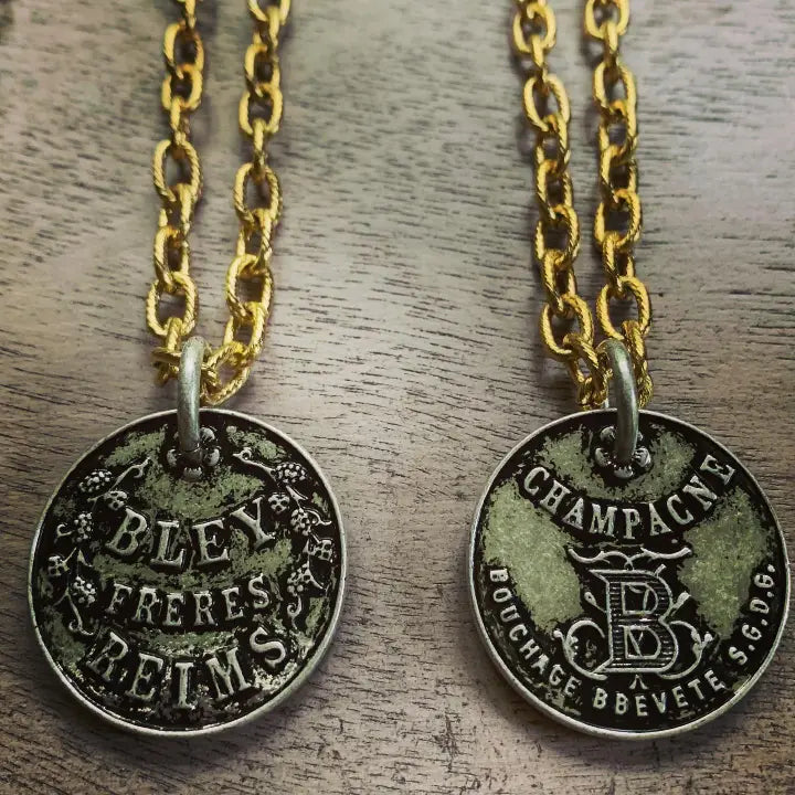 Fizzy is a 28mm beautiful copy of a French marketing token from the Bley Frères champagne house. This medal has substance and I felt it just needed the perfect chain which is 18” of oval links in silver, gold or matte black.