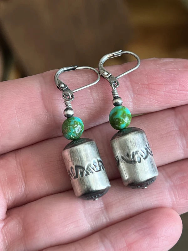 Handcrafted Sterling Silver Stamped Barrel & Sonoran Turquoise Bead Earrings