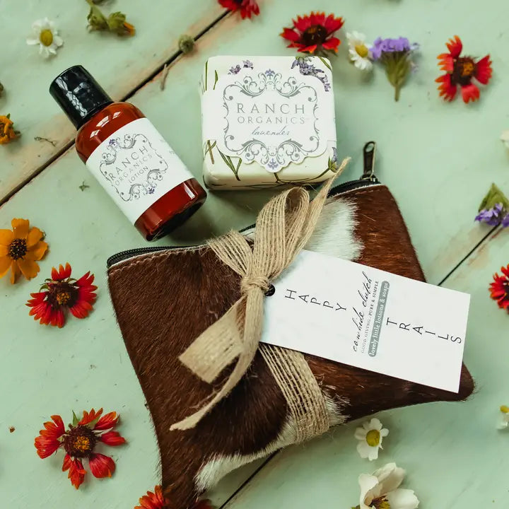 Lovely little gift from our barn to your home! A cowgirl's work is never done. Enjoy our pouch-sized cowhide gift set. We'll pack your zippered genuine cowhide pouch with a Basin-sized Goat Milk wrapped soap and a 2 oz travel lotion. You pick the scent and get ready to be pampered.