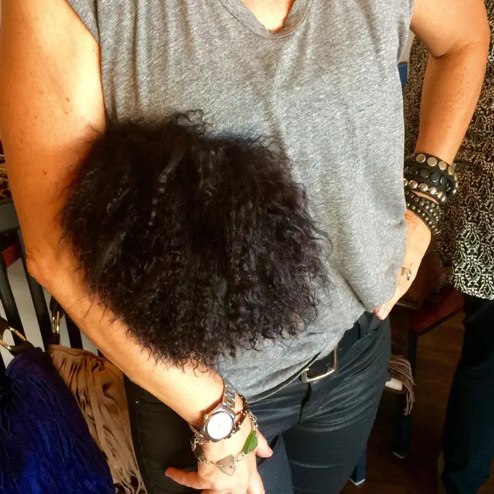 * This girl is the life of the party! * Premium quality mongolian lamb * Heavy duty zip-top mini handbag with wrist strap * Approx. 10" W x 6" x 3" H