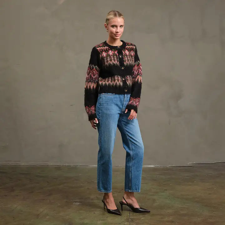 Cozy up in our Icelandic Fuzzy Knit Cardigan — a soft and eye-catching piece that blends vintage charm with modern flair. The relaxed fit, full-length sleeves, and statement buttons make it a perfect layering piece for fall and winter. -Soft brushed knit texture -Multi-color fair isle pattern -Front button closure -Dropped shoulders for a relaxed silhouette
