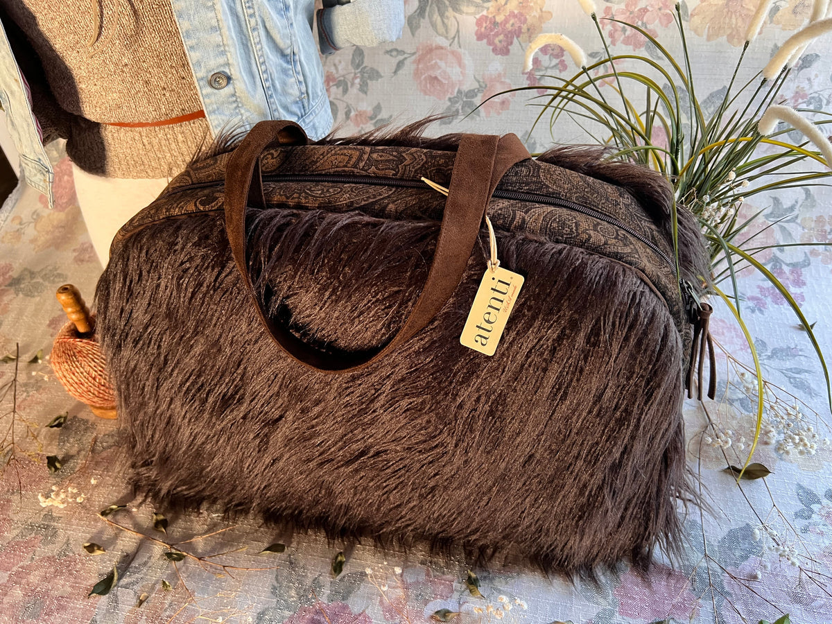 The Atenti Cafe Llama Overnighter is perfect for a weekend away, a knitter’s project bag, an airline carry-on or a diaper bag. The roomy Atenti Overnighter has double straps, a 28″ zippered opening, and a full water-resistant lining. Inside is a zippered pocket and a divided pocket with a cell phone slot. The Atenti Overnighter measures 21″ wide x 12″ high x 7″ deep.