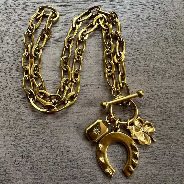 Lucky Cowgirl is a gorgeous heavyweight stainless steel chain with front toggle close and three charms. Gold plated horseshoe, tiny 4 leaf clover and a cz centered rectangle all on an 18.5 inch oval chain.