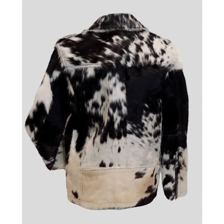 Genuine cow hide fur leather Jacket 22" length (size Medium) Front zip closure Snap-tab collar closure Outside Zip pockets Inside Pocket Zip cuffs Signature Star Lining Meticulous tailoring, zips at the cuffs and an abbreviated hem lend feminine details to a classic style that layers with all your wardrobe essentials. Stay warm and fuzzy all over in our beautiful cow hide fur coat. Size Info Runs small; if between sizes, order one size up.