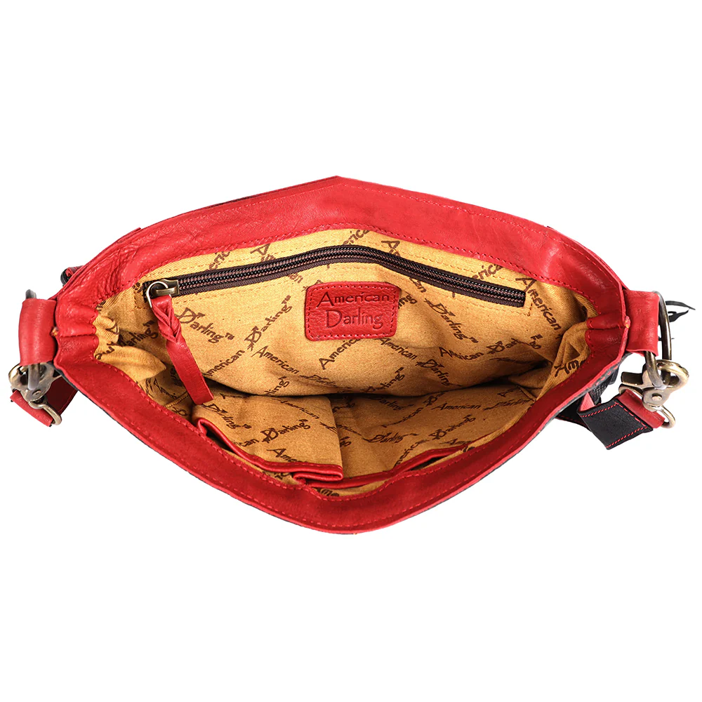 Turn every entrance into a rodeo runway with this bold and unapologetically Western red leather messenger bag. Featuring a hand-cut bronc rider, cactus, arrows, and turquoise-accented flowers, this bag brings rodeo life to the forefront. Crafted from genuine leather, the bag features black fringe, heavy braided edging, and a wide, tooled shoulder strap for comfort and flair.