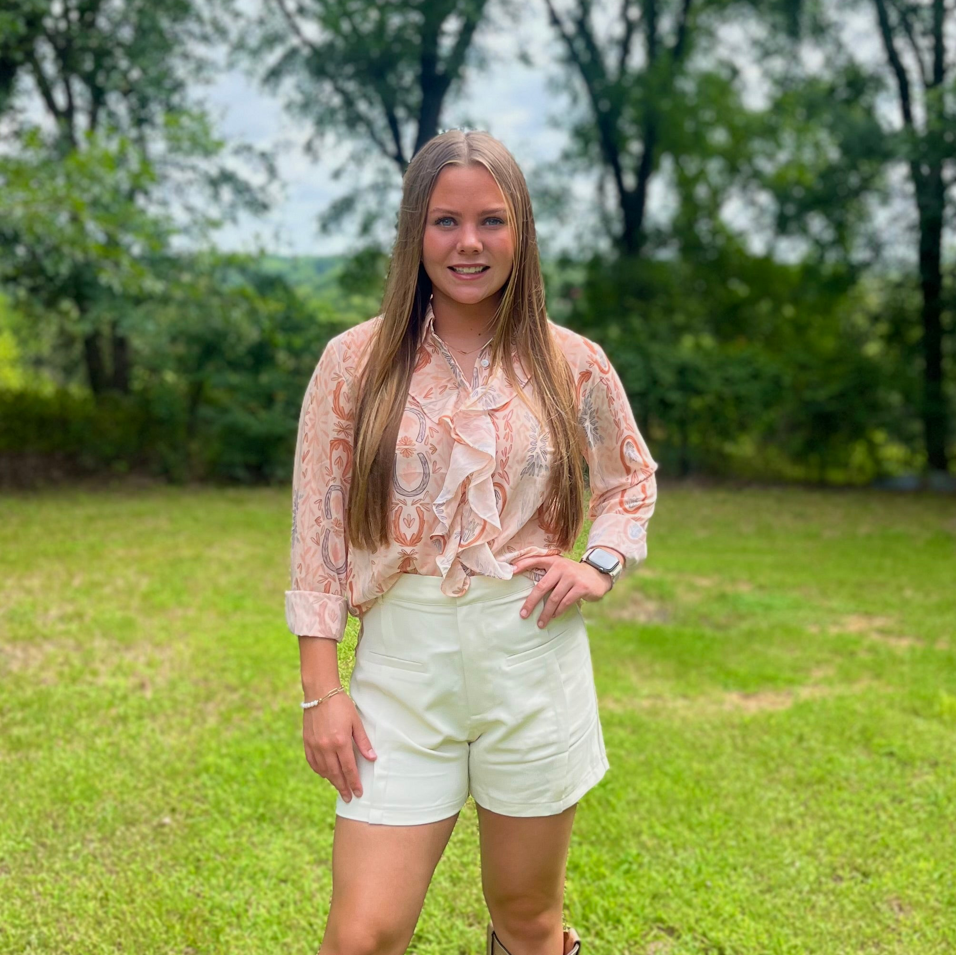 Lightweight sheer blouse with a soft western-inspired print, featuring a collared neckline, button-up front, and cascading ruffle trim. Designed with long sleeves and a relaxed fit, perfect for layering or styling tucked in. 100% Polyester
