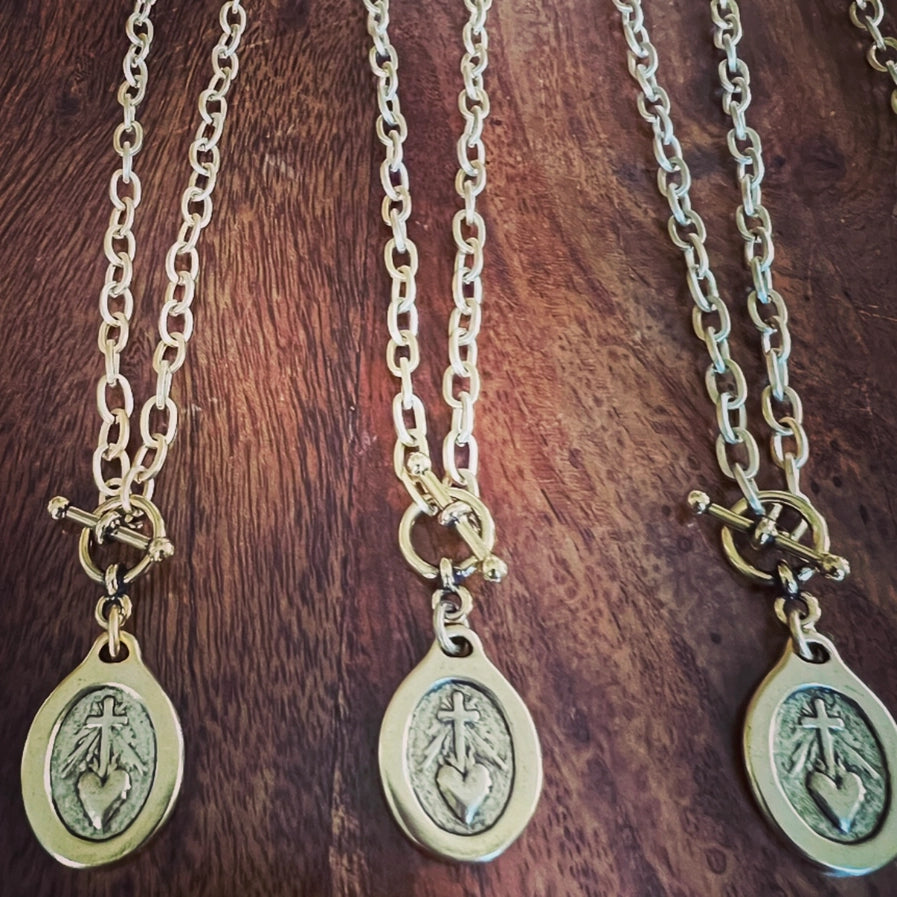 Sacred Heart is a simple elegant necklace made from matte gold flat oval link chain that is 18.5” long with a toggle closure. The chain features a 26mm oval pendant of the Sacred Heart in 12k gold plated pewter.