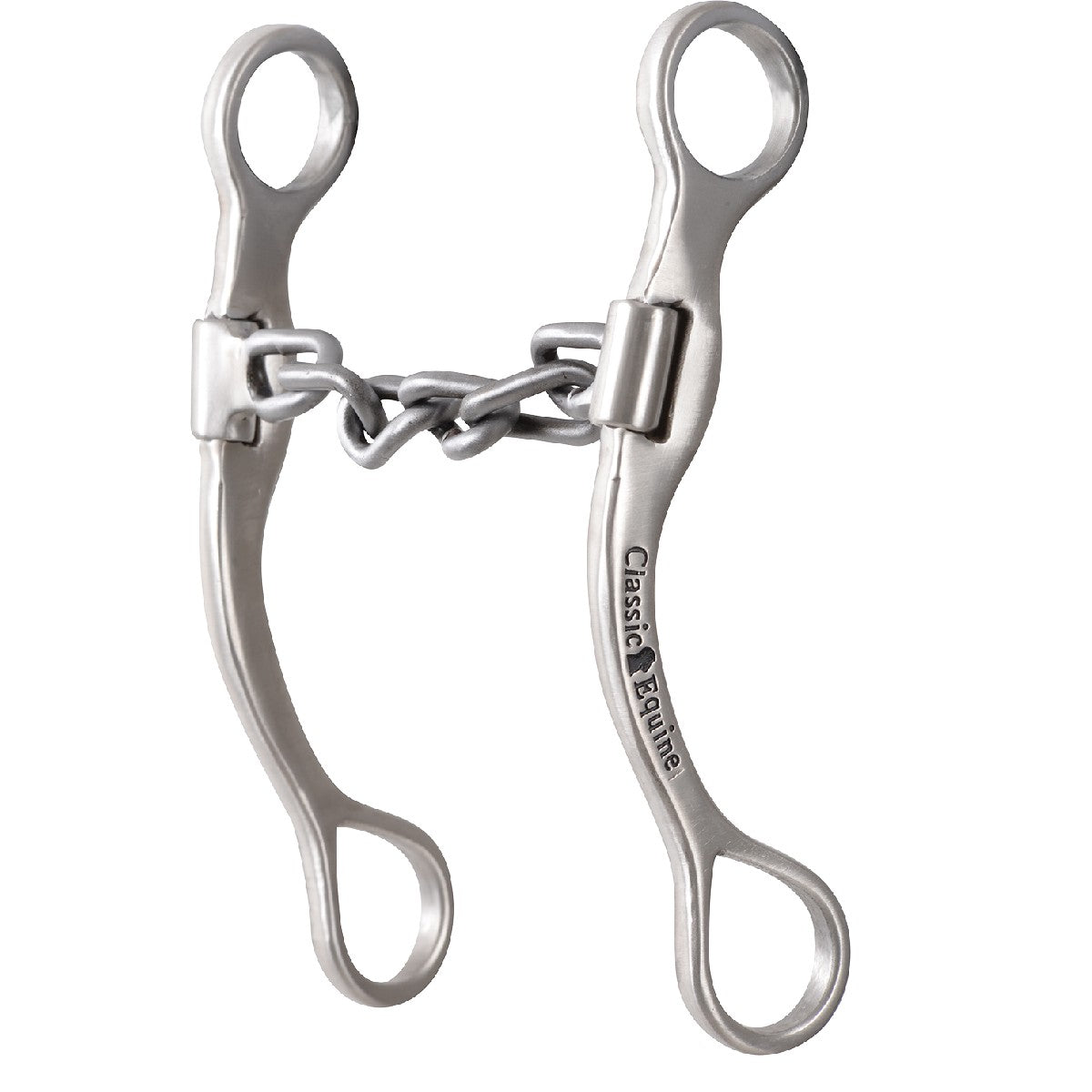 The 7-1/2-inch cheek style is next in the lineup. Extremely versatile, this bit can be used for training drills, pleasure riding, or competition. This cheek has a 2-1/2-inch purchase with a 5-inch shank. The shank is swept back, like the 6-inch model, but to a lesser degree, which offers more leverage and control. When properly adjusted, it is still considered a mild cheek, but one with plenty of leverage for control at increased speeds. The Chain has a stainless steel cheek with an inlaid copper chain mouthpiece. Good tool for reiterating bend and flex. Mild and pinchless sweet iron mouthpiece is comfortable, and applies even pressure to the corners of the mouth and tongue. SSPSBIT7SS30