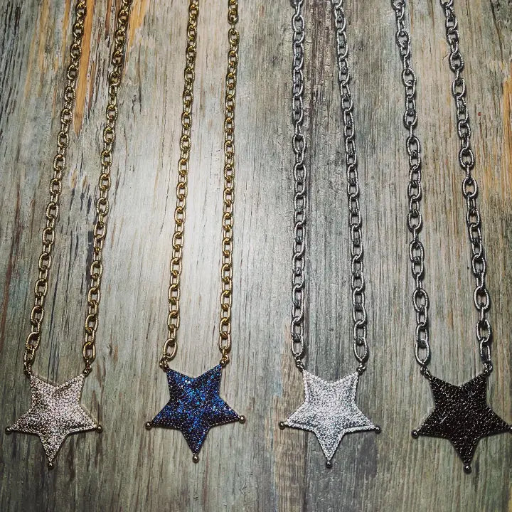 Gorgeous studded end pave star on a textured 9mmx6mm oval link stainless-steel chain.