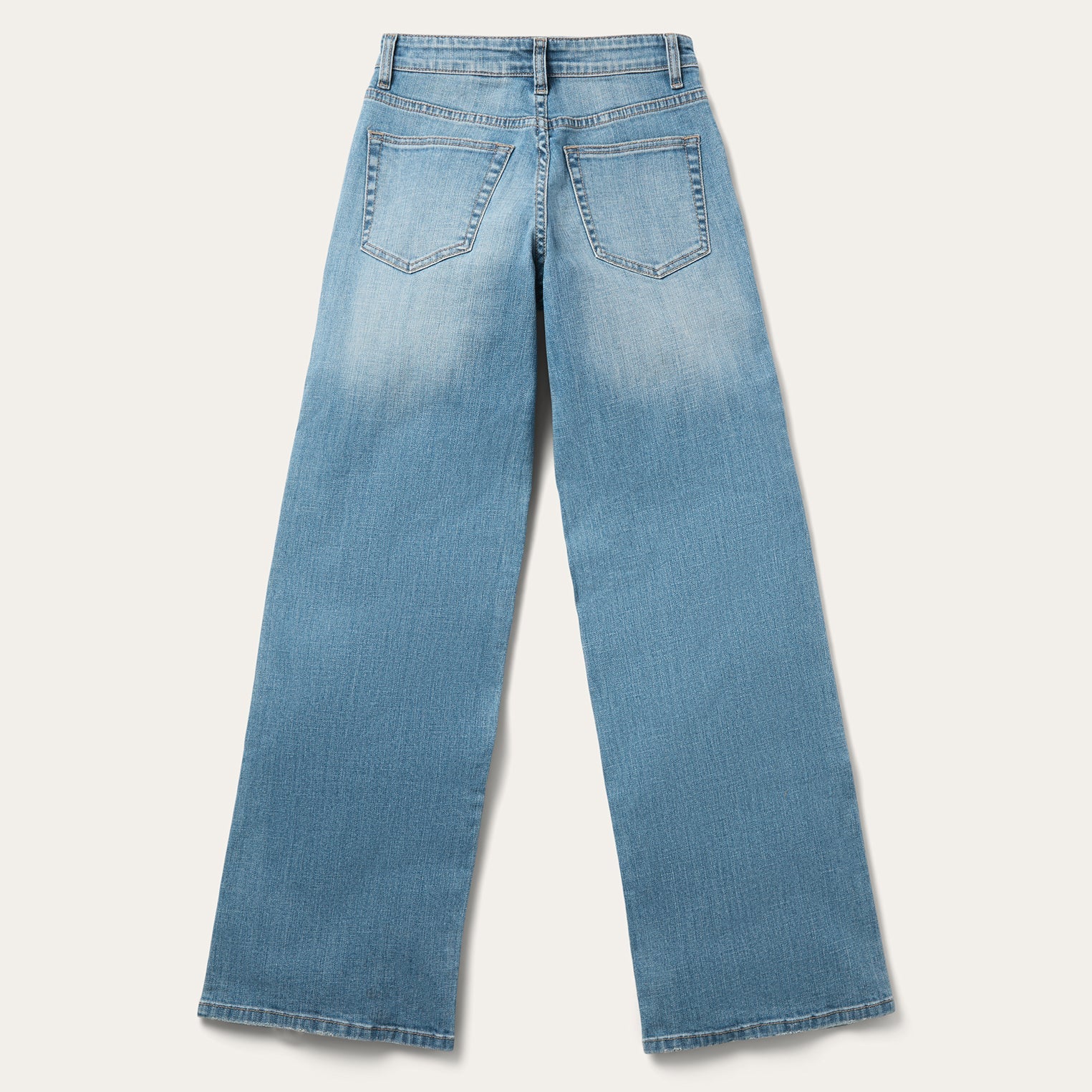 The 675 Mid-Rise Wide Leg Jean is crafted from premium stretch denim that delivers comfort, structure, and a flattering drape. With a mid-rise waist and a wide leg opening, it offers a balanced, timeless silhouette. Details include subtle whiskering and sanding, plain back patch pockets with cursive “R” embroidery, and Stetson-branded hardware.