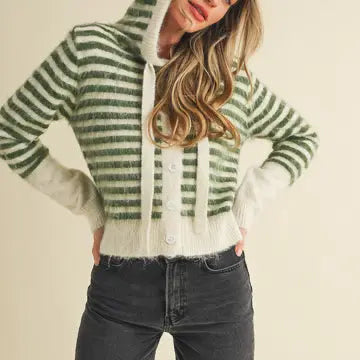Looking your cutest and coziest self is easy in this striped hoodie sweater cardigan! Soft and fuzzy striped knit shapes this relaxed bodice with a functional button down placket and hoodie with drawstrings. Long sleeves end in ribbed cuffs. + Striped hoodie sweater cardigan + Button down placket + Knit drawstring + Long sleeves + Ribbed cuffs and hem